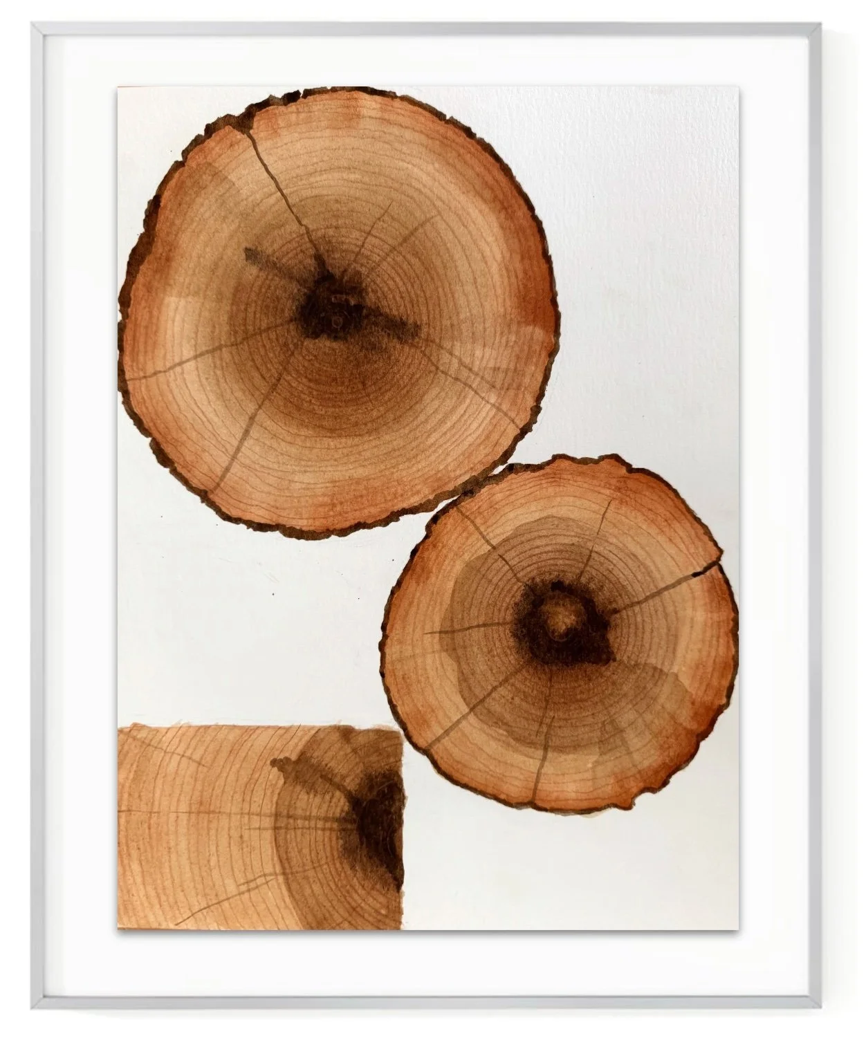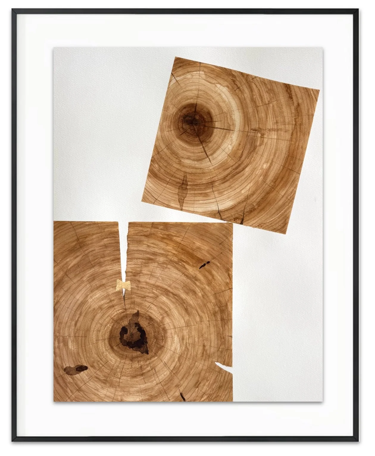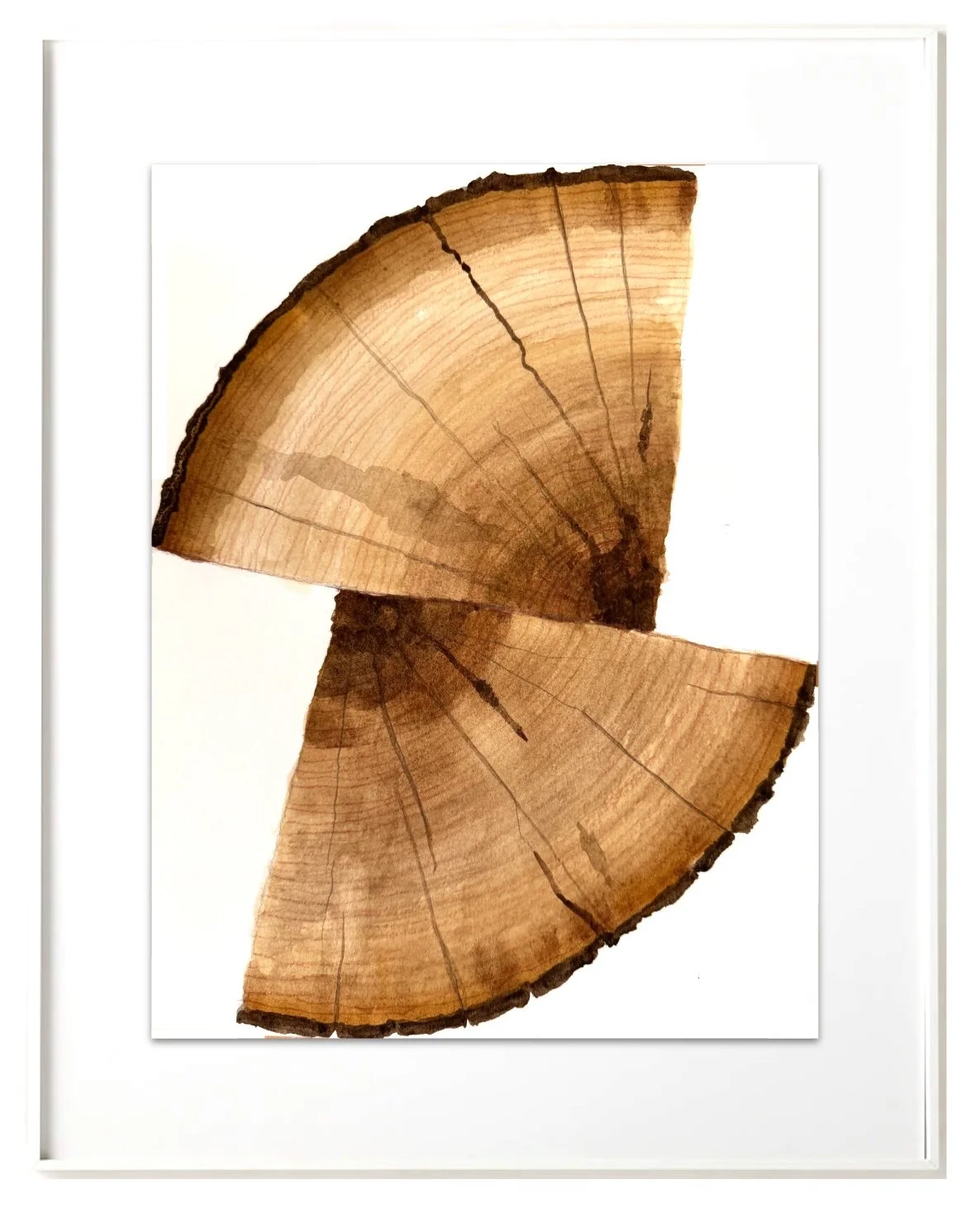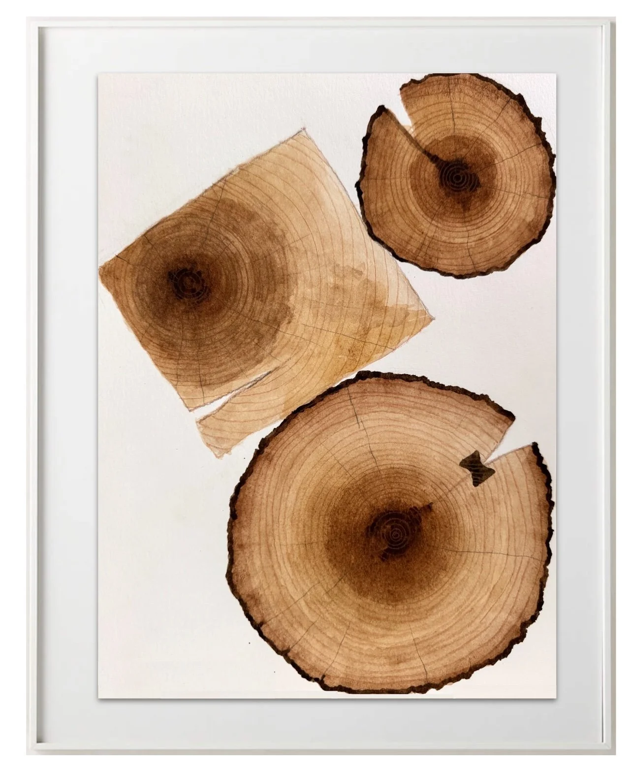Delving into the grain of time, these watercolor paintings explore the layered narratives held within the rings of felled timber. Each fragment tells a story of decades: sun-drenched summers, drought-stricken years, all etched in the silent language of growth. But these stories are not ending; they are evolving. Captured in delicate washes of pigment, these sections of timber are ready to transcend their origins. They stand on the threshold of becoming architectural elements, describing history while forming the framework of tomorrow's spaces. Each of these paintings are a meditation on time's cyclical nature, where the past informs the present, and the present shapes the future.