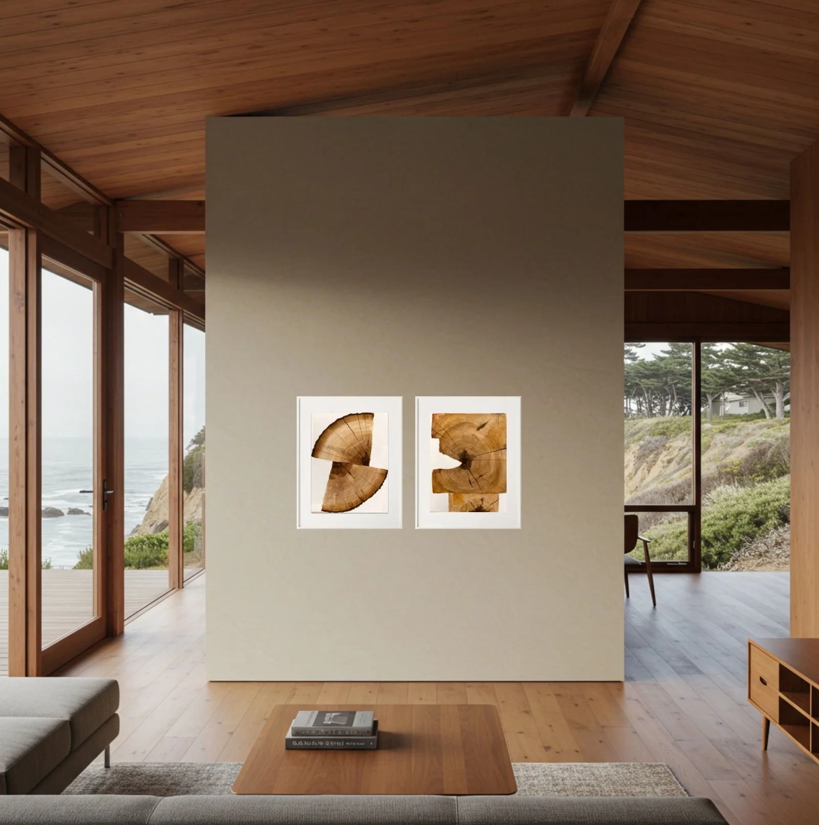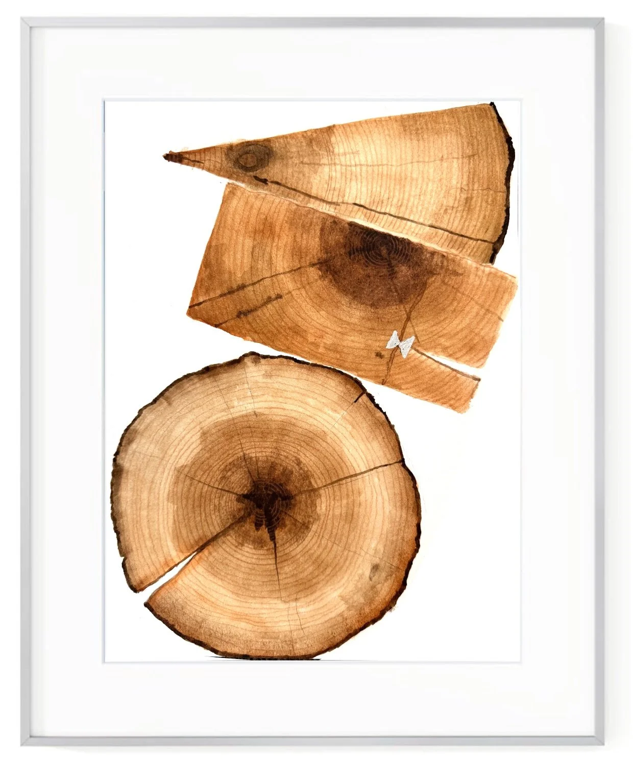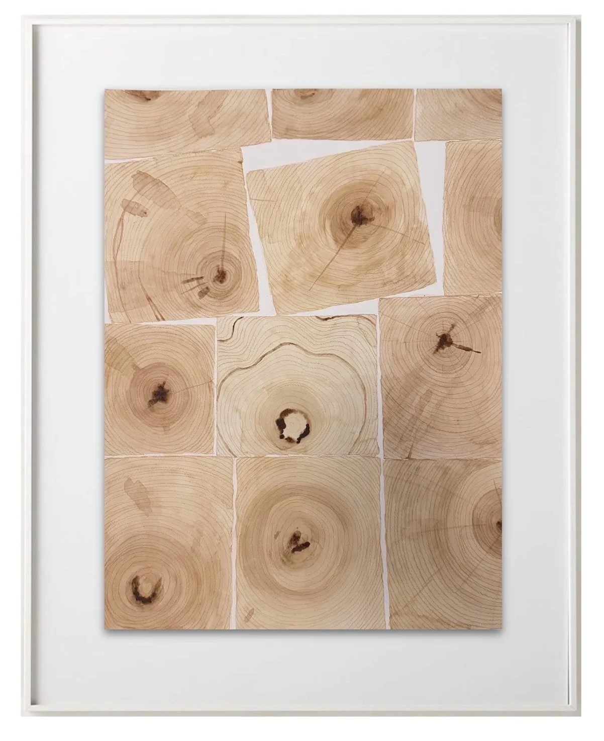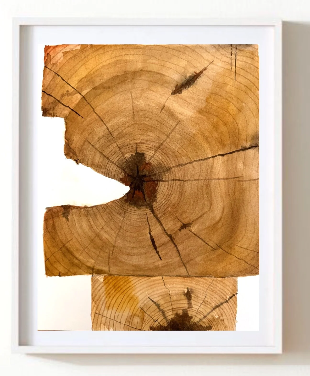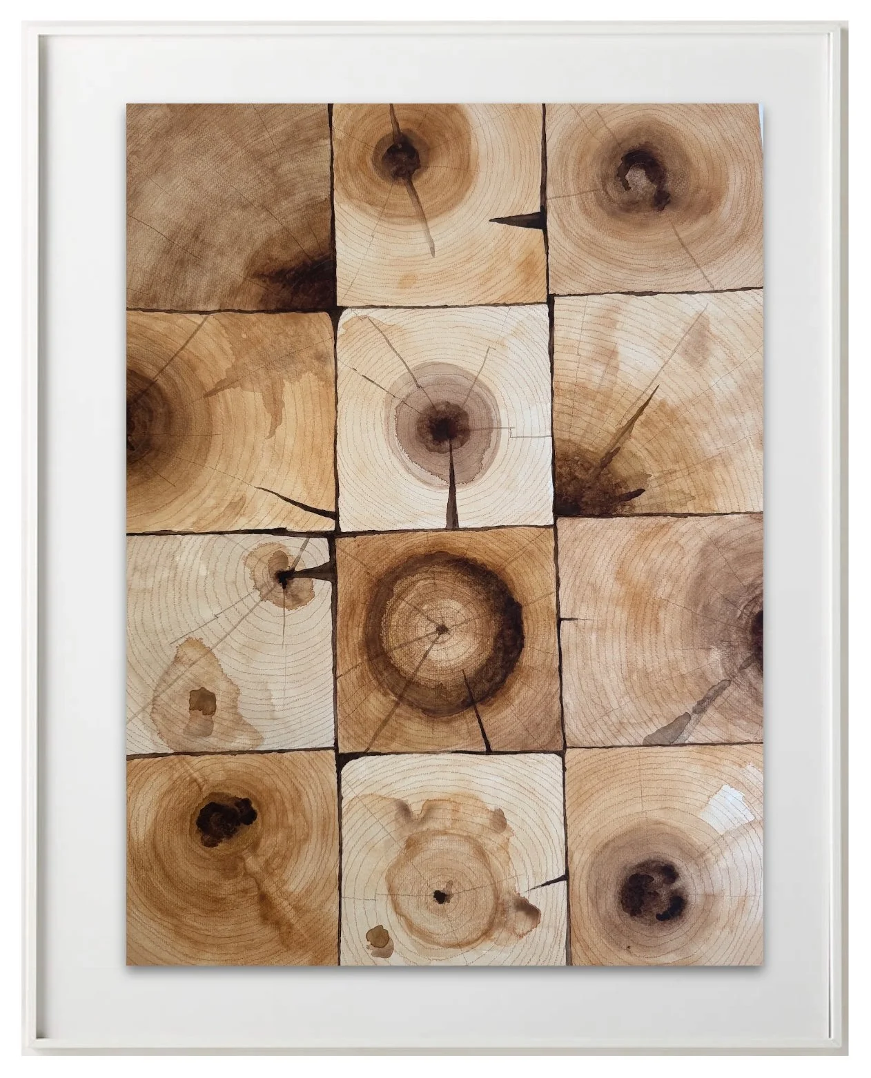Delving into the grain of time, these watercolor paintings explore the layered narratives held within the rings of felled timber. Each fragment tells a story of decades: sun-drenched summers, drought-stricken years, all etched in the silent language of growth. But these stories are not ending; they are evolving. Captured in delicate washes of pigment, these sections of timber are ready to transcend their origins. They stand on the threshold of becoming architectural elements, describing history while forming the framework of tomorrow's spaces. Each of these paintings are a meditation on time's cyclical nature, where the past informs the present, and the present shapes the future.