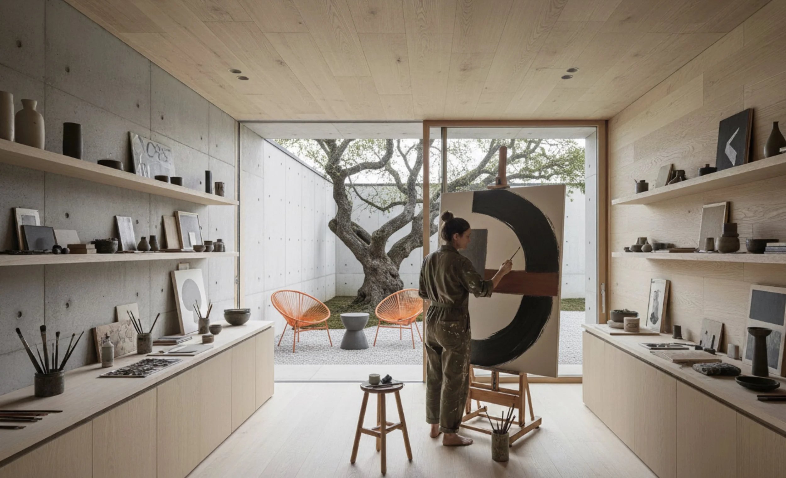 The design strategically orchestrates how light and landscape enter the space. The eastern facade features dramatic, panoramic views of Lake Michigan, offering a visual expanse intended to quiet the noise, connecting one’s mind. Additional moments throughout the home frame more intimate serene moments with more close-up connections to the immediate landscapes and the secluded, contemplative atmosphere of the meditation garden. This dual experience provides both exhilaration and deep, calming integration with the local ecosystem.